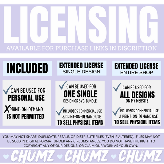 • This is an Extended Commercial Use License that allows you to print and sell ANY & ALL Future designs purchased from CHUMZ website.